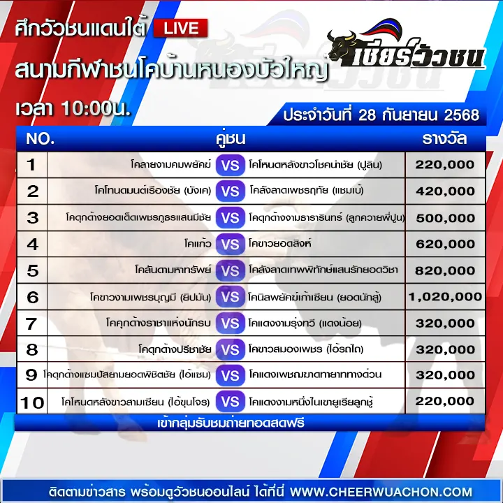 โปรแกรมวัวชน สนามกีฬาชนโคบ้านหนองบัวใหญ่ วันที่ 28 กันยายน 2568
