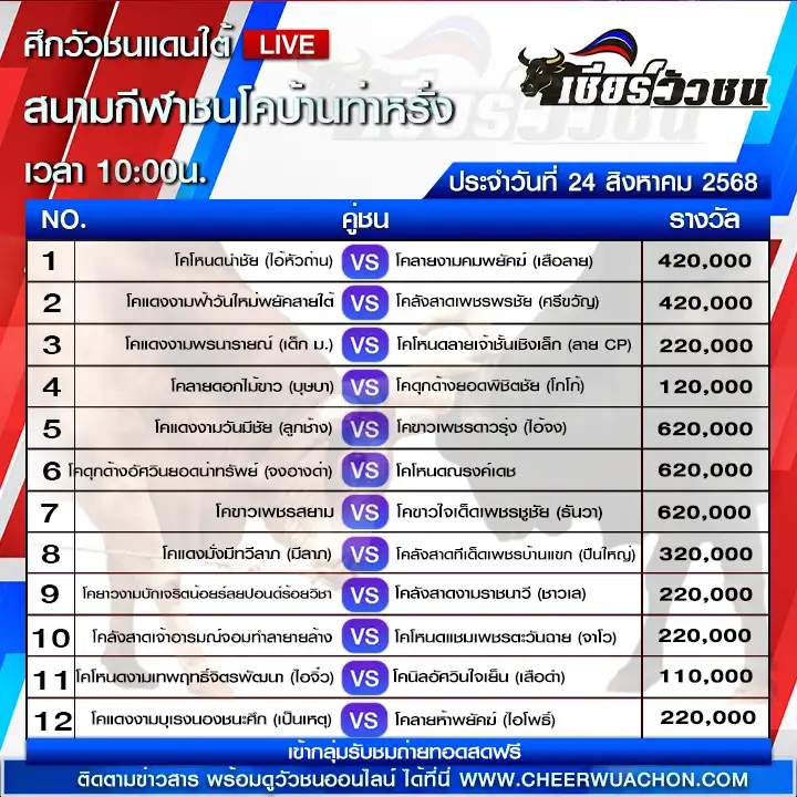 โปรแกรมวัวชน สนามกีฬาชนโคบ้านท่าหรั่ง วันที่ 24 สิงหาคม 2568