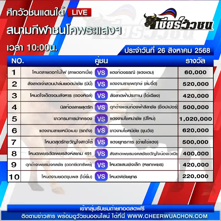 โปรแกรมวัวชน สนามกีฬาชนโคพระแสงคอมเพล็กซ์ วันที่ 26 สิงหาคม 2568