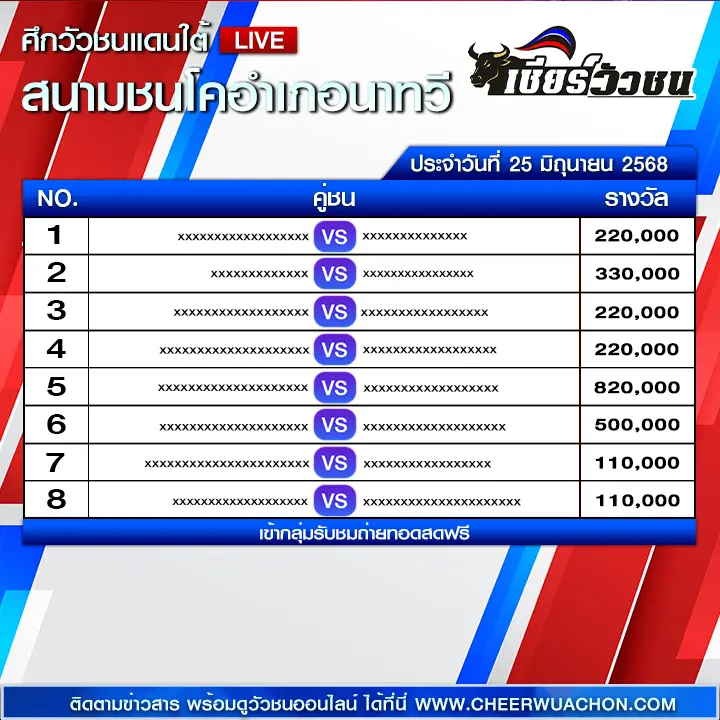 โปรแกรมวัวชน สนามกีฬาชนโคพระแสง วันที่ X2 XXX 2568