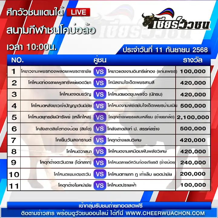โปรแกรมวัวชน สนามกีฬาชนโคบ้านบ่อล้อ วันที่ 11 กันยายน 2568