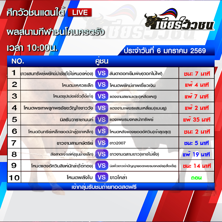ผลวัวชน สนามกีฬาชนโคนครตรัง วันที่ 6 มกราคม 2569