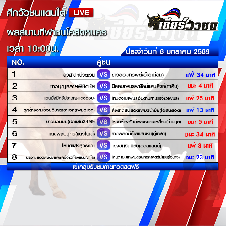 ผลวัวชน สนามกีฬาชนโคสิงหนคร วันที่ 6 มกราคม 2569