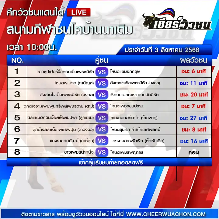 สรุปผลวัวชน สนามกีฬาชนโคบ้านนาเดิม วันที่ 3 สิงหาคม 2568
