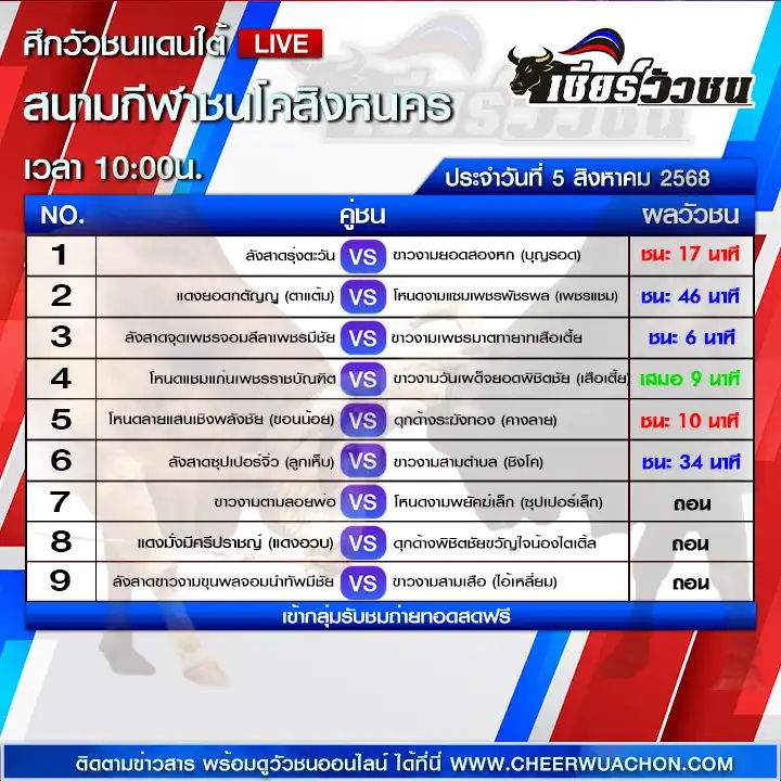สรุปผลวัวชน สนามกีฬาชนโคสิงหนคร วันที่ 5 สิงหาคม 2568