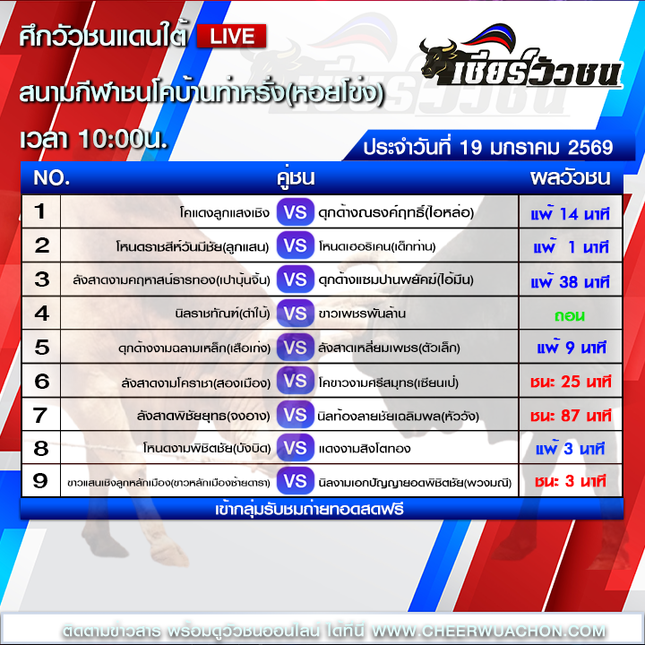 ผลวัวชน สนามกีฬาชนโคบ้านท่าหรั่ง วันที่ 19 มกราคม 2569
