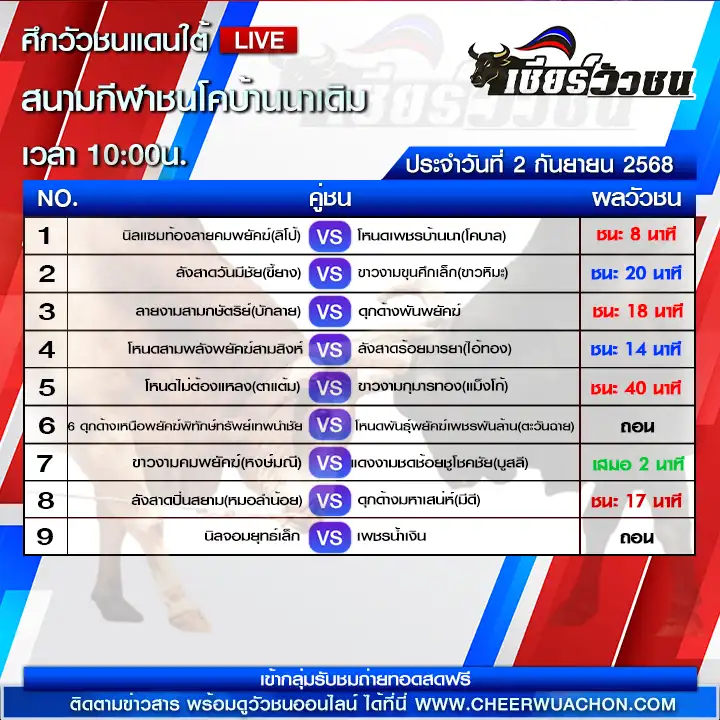 ผลวัวชน สนามกีฬาชนโคบ้านนาเดิม วันที่ 2 กันยายน 2568