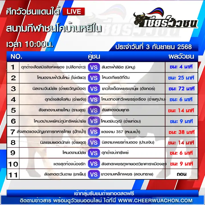 ผลวัวชน สนามกีฬาชนโคบ้านหยีในวันที่ 3 กันยายน 2568