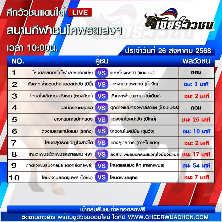 สรุปผลวัวชน สนามกีฬาชนโคพระแสงคอมเพล็กซ์ วันที่ 26 สิงหาคม 2568