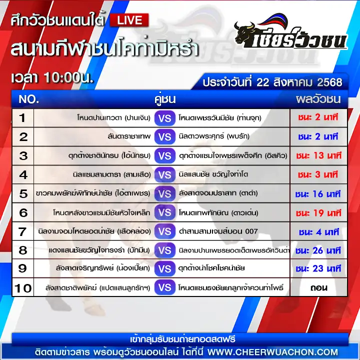 สรุปผลวัวชน สนามกีฬาชนโคท่ามิหรำ วันที่ 22 สิงหาคม 2568