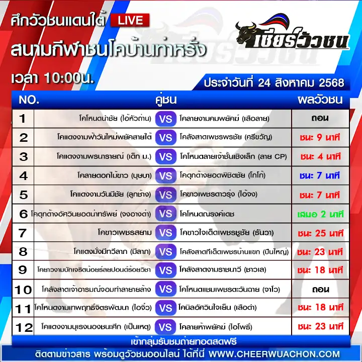 สรุปผลวัวชน สนามกีฬาชนโคบ้านท่าหรั่ง วันที่ 24 สิงหาคม 2568